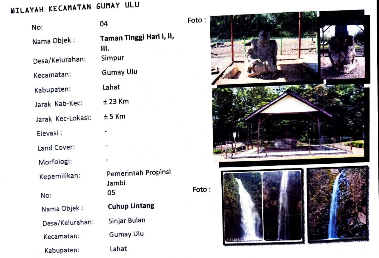 Taman Tinggi Hari I, II dan III, Megalit kuhut Majapahit, Megalit Prajurit, Megalit Tinjak Banyak, Taman Nik Kambing, Cuhup Lintang, Pemancingan Alam, Pemancingan Cekdam, Taman Megalit Batu Tegas, Cuhup Maung, Cuhup Buluh, Cuhup Pasemah |