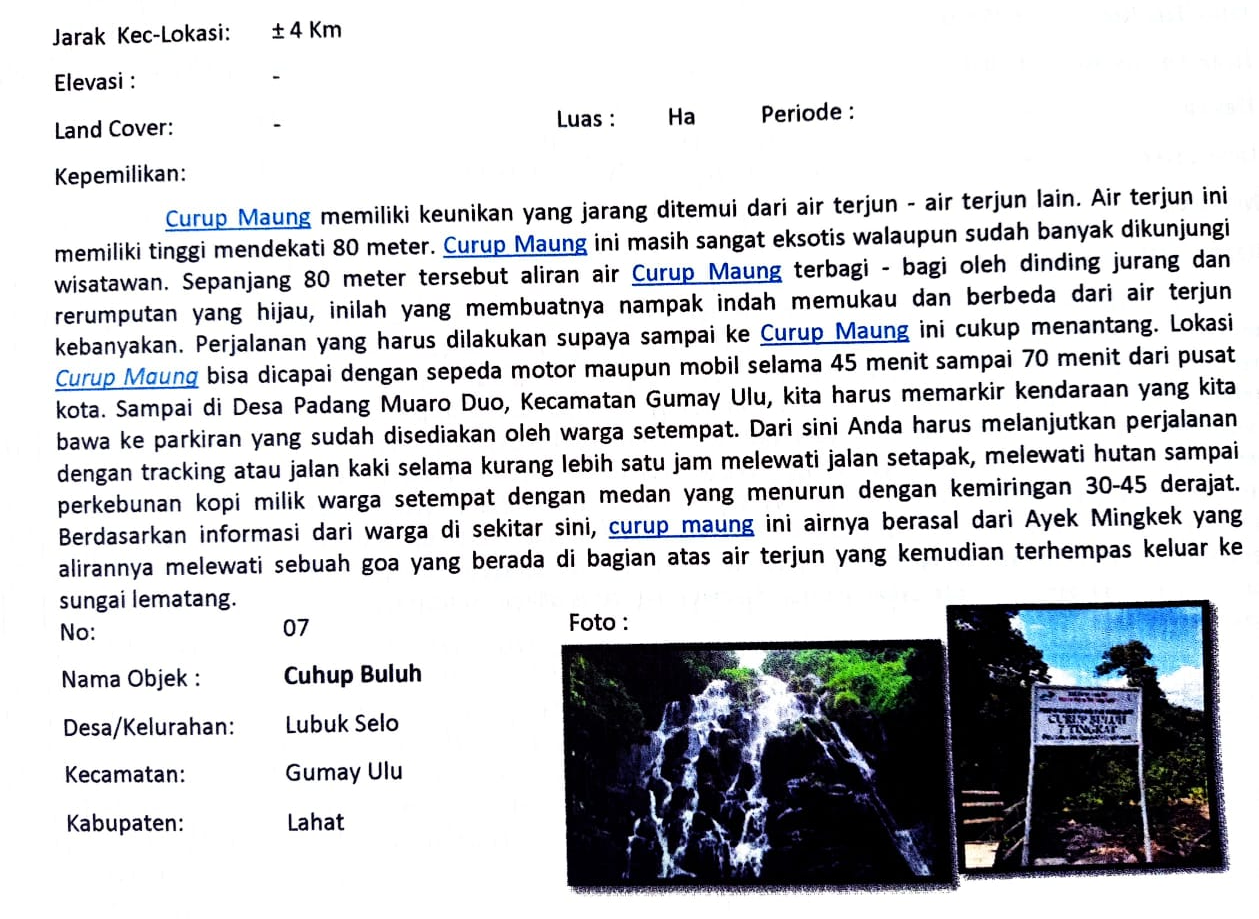 Marung Batu, Curup Bemban, Air Panas, Curup Laye dan Gua Laye, Curup Air Ugul Besak, Curup Air Ugul Kecik, Batu Macan, Ribang Gayau, Gua Masanap Masaris, Tunggul Bute, Meriam Bujang Padang, Rumah Bahi, Air Panas Kembuhuk, Candi Dayang Rindu |